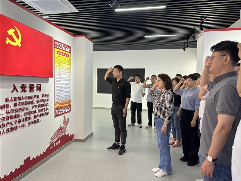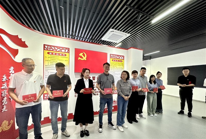 會前,集團(tuán)黨建園地內(nèi),董事長楊靜帶領(lǐng)全體黨員重溫入黨誓詞,為上半年過政治生日的同志贈送政治生日賀卡。